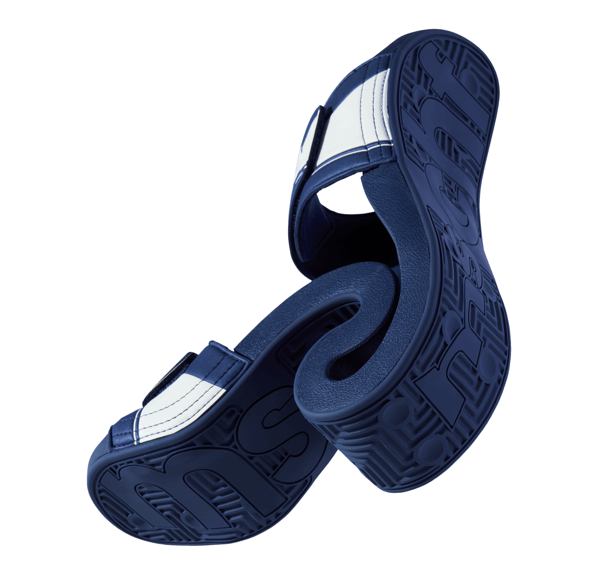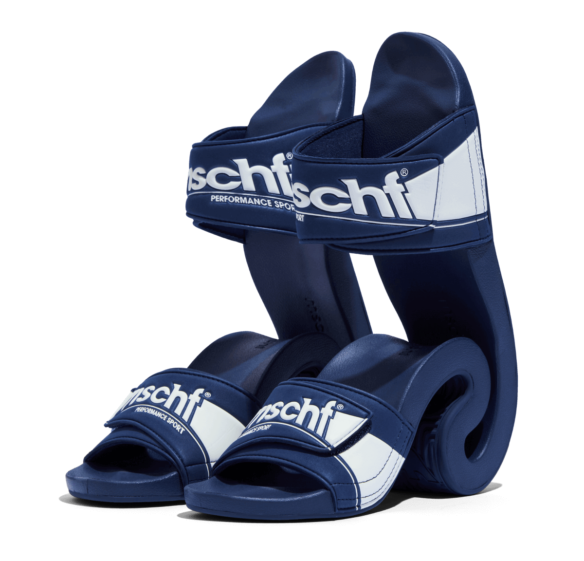 Inspired by classic kick-around pool slides, conjoined, lengthened, and curled up into a 4.5” loft high heel. Flip, flop over, and kick your feet up. It’s summer, baby. Materials/details: 4.5” heel height, adjustable ankle strap, fixed forefoot strap, comfy EVA footbed, rubber sole.